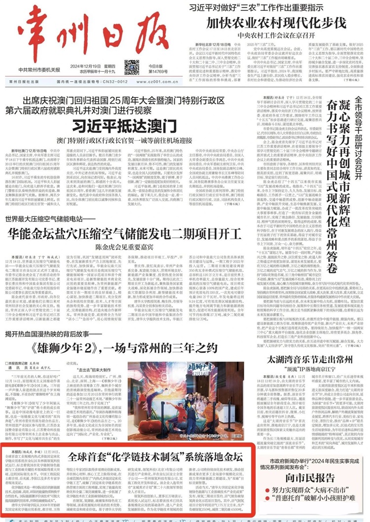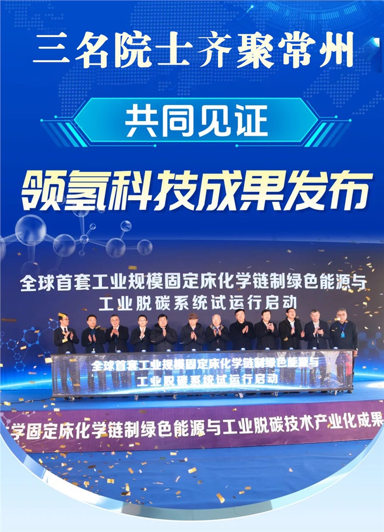 2024年12月18日,全球首套工業(yè)規(guī)模內(nèi)熱式多級固定床化學(xué)鏈應(yīng)用系統(tǒng)在常州領(lǐng)氫科技試運(yùn)行,這標(biāo)志著我國在化學(xué)鏈制綠色能源與工業(yè)脫碳關(guān)鍵技術(shù)領(lǐng)域取得重大突破,達(dá)到國際領(lǐng)先水平。中國工程院院士郝吉明、岳光溪、李陽以及多名教授專家學(xué)者及知名企業(yè)家現(xiàn)場見證。《常州日報(bào)》更是在頭版刊發(fā)要聞《全球首套“化學(xué)鏈制氫”系統(tǒng)落地金壇》,報(bào)道領(lǐng)氫科技全球首套“工業(yè)規(guī)模內(nèi)熱式多級固定床化學(xué)鏈應(yīng)用系統(tǒng)”啟動試運(yùn)行。